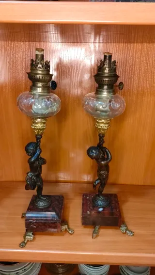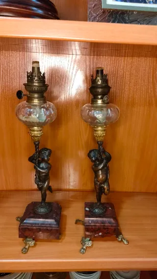 Elegante coppia di lampade da tavolo in stile quinqué con figure di cherubini. Base in marmo venato. Figure di cherubini in metallo. Applicazioni in bronzo. Cupole in vetro trasparente. MISURE: Larghezza 13cm Profondità 13cm Altezza 44cm Collezione antica di lampade Quinqué Cherubini. Decorazione retrò. ALTRI ARTICOLI NEL MIO PROFILO. Abbiamo un negozio fisico. Visitateci in Calle de la Imagen 26 ENTREVÍAS CAP 28018. SECONDA MANO E RASTRO TINA. Il nostro orario è dalle 9 alle 14 e dalle 16 alle 20:30 dal lunedì al sabato. Sabato pomeriggio dalle 16 alle 19:30.