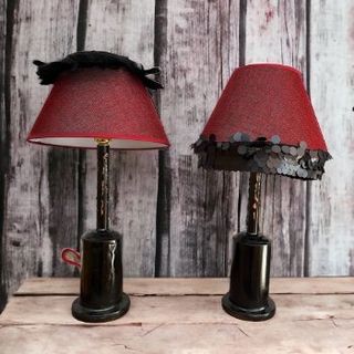 Set di due lampade da tavolo con un design classico ed elegante. La base e il piede sono in metallo scuro, mentre gli schermi sono in tessuto rosso con dettagli decorativi. Caratteristiche: - Schermi in tessuto rosso. - Base e piede in metallo. - Decorazioni nella parte inferiore degli schermi. - Decorazione con piume su uno degli schermi.