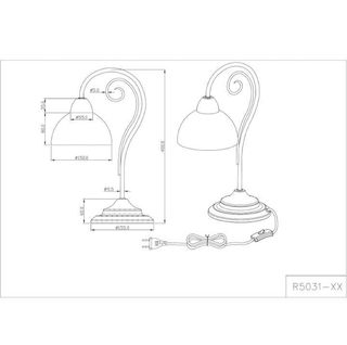 Set di due lampade da tavolo con un design elegante. Colore ramato. Base e braccio in metallo con finitura invecchiata. Schermo in cristallo bianco traslucido. Cavo con interruttore.