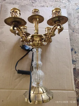 2 Eleganti lampade da tavolo con un design classico e sofisticato. -5 lampadine per lampada. - Base in cristallo trasparente. - Finitura in metallo dorato. - Più bracci per candele.