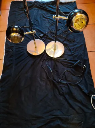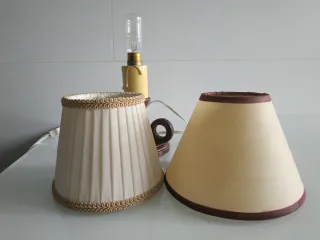 Set di due lampade da tavolo con un design vintage. - Schermi in tessuto color beige. - Basi e corpi in legno nero. - Decorazione decorativa sugli schermi. Sono antiche ma verniciate con vernice di buona qualità, il cavo è stato sostituito. La base è metallica con un buon peso, isolante della lampadina in porcellana. Se si desidera cambiare lo schermo, si trovano facilmente in ferramenta, Leroy, Shein, AliExpress, ecc. Lo schermo può presentare alcune crepe nel plastica interna. Hanno lampadine LED