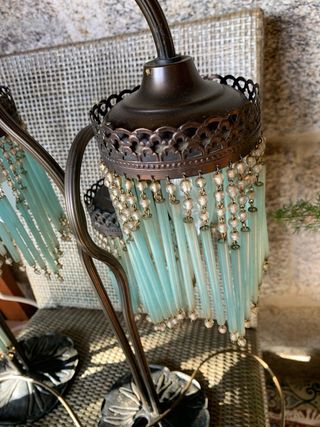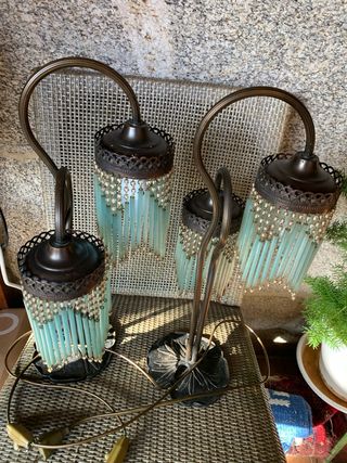 Coppia di lampade da tavolo antiche dal design elegante e decorativo. Perfetto per aggiungere un tocco vintage a qualsiasi spazio. - Struttura in metallo con dettagli ornamentali. - Perle di vetro e aste decorative. - Lampadina inclusa.