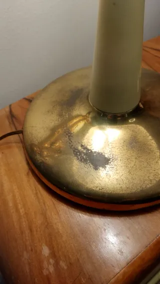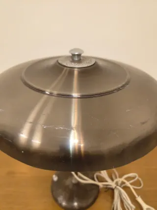 Lampada da tavolo dal design unico, risalente agli anni '50. Un pezzo d'arredo che aggiunge un tocco vintage, con segni del tempo e qualche graffio sul cappello, necessita di un restauro, ma anche così mantiene il fascino del tempo. - Struttura in metallo. - Dettagli in plastica.