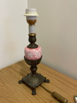 Elegante lampada da tavolo con un corpo centrale in ceramica decorata e una base in bronzo finemente lavorata. Bellissima lampada da tavolo in ceramica rosa e bianca con base in bronzo e piedini a forma di artiglio. La parte elettrica va verificata perché non riesco ad accenderla (credo sia il filo elettrico che non fa contatto). Presenta qualche segno del tempo ma è bellissima Altezza 33 cm
