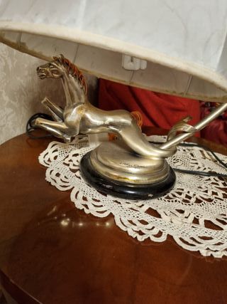 Lampada da tavolo Ottaviani, con scultura di cavallo, rivestita in argento 800, paralume da riattaccare, lampadina attacco piccolo, alta cm 38, larga cm 35. - Base in metallo con finitura argentata e dettagli neri. - Figura di cavallo stilizzato in metallo. - Paralume in tessuto di colore chiaro.