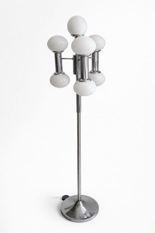 Lampada da terra vintage in metallo cromato con tulipani in vetro bianco. Design tipo 'sputnik', supporta fino a 7 lampadine con attacco standard (E27). Altezza circa 160 cm. Diametro della base: 30 cm. Presenta segni di usura, soprattutto sulla base cromata, con usura e perdita di lucentezza tipiche del passare del tempo. Il resto della struttura e i tulipani sono in buone condizioni, senza rotture. Funziona correttamente. Ideale come pezzo decorativo o per chi cerca una lampada con carattere ed estetica retrò.