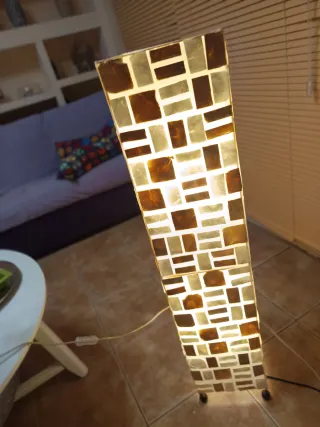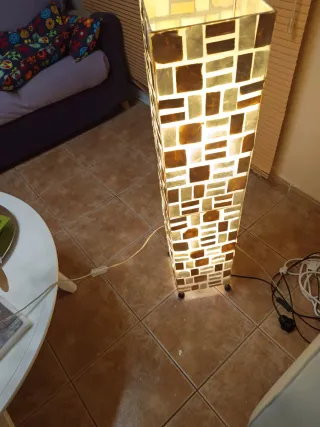 Lampada da terra elegante con un design unico a mosaico, che evoca l'estetica degli anni '70. La sua struttura combina toni caldi e neutri, creando un ambiente accogliente. Design a mosaico con pezzi rettangolari e quadrati. Dona alla stanza un ambiente fresco e divertente. Si adatta a qualsiasi arredamento e stanza, dando un tocco molto personale. Il prezzo è privato. Nessuna spedizione, ritiro a Santa Cruz.