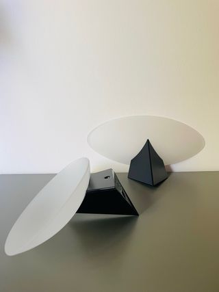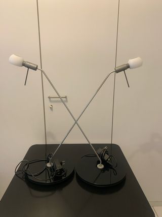 Coppia di lampade da tavolo dal design moderno. di Fontana Arte mod. Vega designer Michele de Lucchi anno 1986 , ora fuori produzione, sono funzionanti ma necessitano di un restyling sulle aste e sul cavo del trasformatore - Struttura in metallo. - Diffusori in vetro. - Base rotonda in vetro cristallo nero - filo alimentazione da sostituire anche se funzionante - Entrambe i diffusori luce presentano crepe con successive incollature del vetro , purtroppo dopo una ricerca non sono stati trovati i ricambi in vetro opaco - Very vintage e per amanti del design e del restauro - prezzo trattabile
