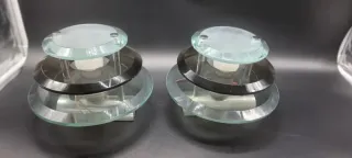 Pago tramite Bizum o bonifico bancario. Set di due lampade dal design vintage. Parole chiave: fase, Bauhaus, lampara, gei, metalarte, Bauhaus, fontana, arté, space age, orologio, vinile, twemco, Elsa, ancora, antico. - Struttura in metallo e dettagli in vetro. - Base quadrata con finitura argentata. - Paralume traslucido.