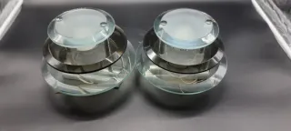 Elegante coppia di lampade di design attribuite a Fontana Arte realizzate nel 1960, Misurano di diametro cm 20 e alte cm 16 - Realizzate in vetro e metallo. - Colore trasparente e nero.