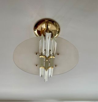 Lampada da soffitto Foscarini elegante con un design moderno e sofisticato. Finitura principale in oro brillante. Dettagli in cristallo trasparente. Struttura metallica robusta. 100€ per il soggiorno, 150€ per la sala da pranzo