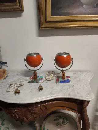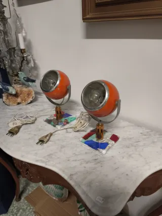 2 lampade vintage italiane Space Age degli anni 70. Foco orientabile in metallo arancione (alcuni segni) e base con diversi colori. Installazione elettrica funzionante. Ideale per una camera da letto o soggiorno. Misura 23 cm di altezza e 14,3 x 12,4 cm di larghezza. VDV2151 kartell midcentury Hollywood regency lamparita Hispania Willy Rizzo eclisse Vico magistretti danés aka veb Bauhaus jucker metalarte vitra knoll retro antico vintage sputnik design scandinavo nordico ferroart sol lupela bambu flexo aplique moderno futuristico comodino notte faro sedia poltrona comoda specchio Lladró Manises Bondia porcellana eyeball fase cronaca cesca Foster venini