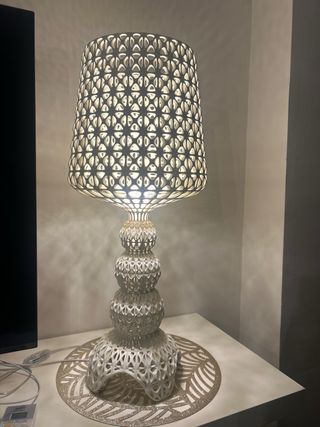 Lampada da tavolo elegante con un design moderno e sofisticato. Intensità della luce regolabile. Modello mini Kabuki di Kartell. Base ampia e stabile. Schermo con un motivo traforato che proietta belle ombre.