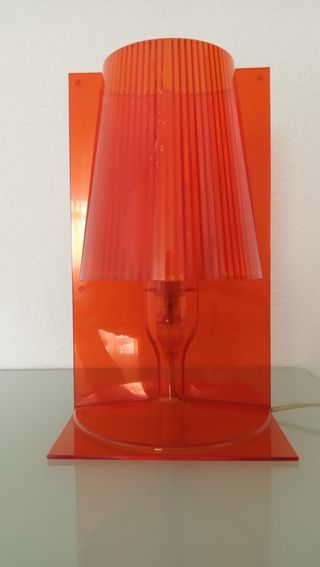 Lampada Kartell modello Take, nel bellissimo colore arancione. Misure circa 31 cm di altezza, 18 cm x 18 cm. LEGGERE CON ATTENZIONE!!! La lampada funziona perfettamente e si presenta in buone condizioni generali, tuttavia sono presenti tracce di colla (perché si apriva da entrambi i lati). Per questo motivo il prezzo è così basso.
