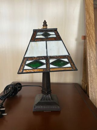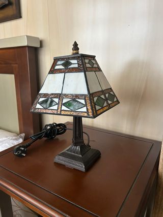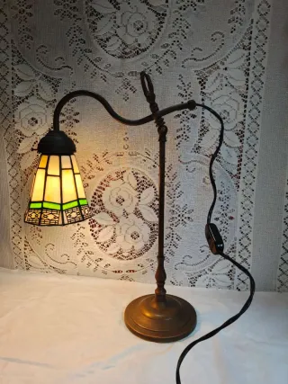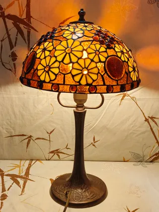 Lampada da comodino elegante con un design ispirato a Tiffany. Lo schermo in cristallo e metallo crea un ambiente caldo e accogliente. - Schermo con frammenti di cristallo colorato e motivi floreali. - Base e dettagli metallici ornamentali. - Cavo di alimentazione con interruttore. Una di esse ha un difetto.
