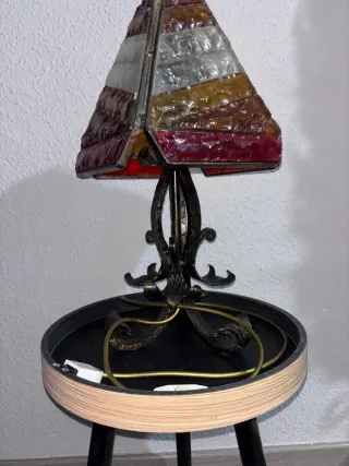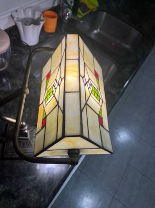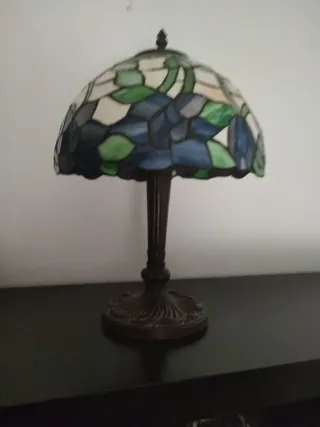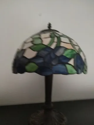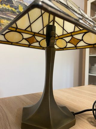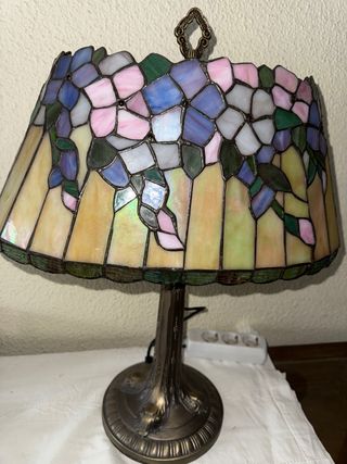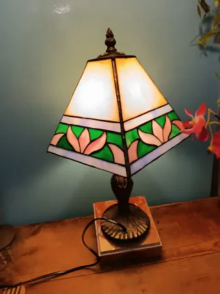 Lampada da tavolo Tiffany elegante, esclusiva e originale, che può trasformare qualsiasi angolo della casa in un luogo squisitamente decorato. Vetri color avorio circondati alla base da una cornice colorata e fiorita, compongono armoniosamente una preziosa forma geometrica. Il piede è grandioso per bellezza e conferisce grande distinzione e un tocco di nobiltà all'insieme. L'altezza totale è di 62 cm. Lo schermo ha il diametro maggiore di 42 cm, il minore di 37 cm e 30 cm alla base. Può essere inviata tramite Wallapop adeguatamente protetta e si paga solo quando la si riceve e si è soddisfatti.