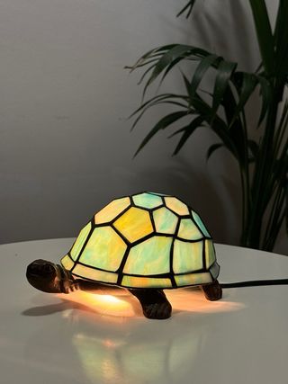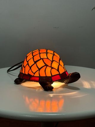 Lampada a forma di tartaruga in stile Tiffany, è metallica e ha un peso che la rende molto stabile, con il guscio in cristalli di resina saldati in stile vetrata. Offre una luce molto accogliente senza abbagliare, perfetta per una camera da letto. Dimensioni: 20x15 cm e 10 cm di altezza. Nuova, spedita ben protetta nella sua scatola originale, senza lampadina inclusa.