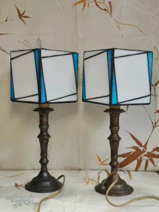 Elegante coppia di abat-jour , perfette per aggiungere un tocco di classe a qualsiasi ambiente. Coppia lampada da tavolo/lampada da comodino - Design geometrico moderno. - Dettagli in vetro colorato blu e bianco. - La base è una coppia di candelabri in ottone antico. - Dimensioni: circa 34 x 12,5 x 12,5 cm. - Utilizza lampadine E14. Le lampadine non sono in vendita.