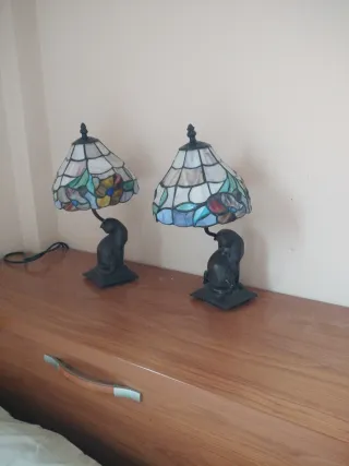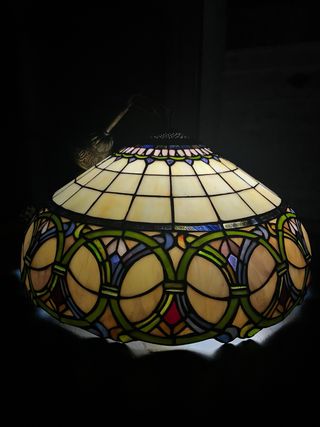 Set di tre lampade in stile Tiffany, ciascuna con un design unico. Realizzate con pezzi di vetro e dettagli metallici. Tonalità beige e multicolor che apportano calore. Disegni floreali e di uccelli. 100€ per tutte e 3, 40€ ciascuna separatamente.