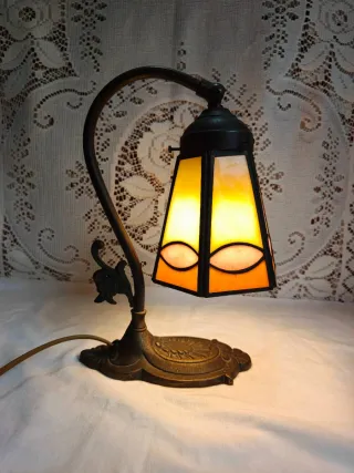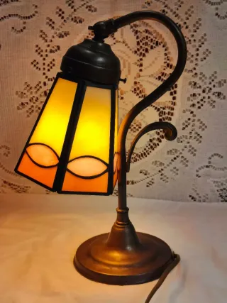Elegante lampada da tavolo con un design unico. - Base in metallo finemente lavorata. - Paralume in vetro colorato con sfumature arancioni e gialle. - Dettagli decorativi floreali sul fusto. - Dimensioni: circa 27×17×11 cm. Sono disponibili due modelli simili. Il prezzo indicato è per un singolo articolo.