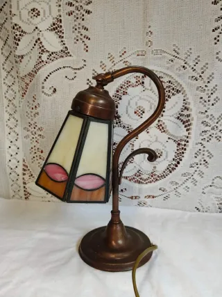 Piccola lampada Tiffany con schermo in vetro piombato e base in bronzo. Il costo era di oltre 300€. Presenta piccoli difetti impercettibili dovuti al tempo. Dimensioni: 34 cm di altezza e 15 cm di diametro. Marca perenz. Stile Tiffany, art nouveau, art decò.