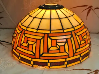 Bellissimo paralume in stile Tiffany, con un design geometrico che ricorda un intreccio. - Realizzato con pezzi di vetro colorato. - Motivo a fasce con sfumature di arancio e giallo. - Bordatura superiore scura.