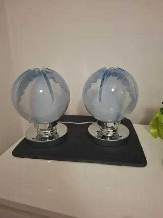 Coppia di lampade vintage con un design sferico unico. Perfette per aggiungere un tocco di stile retrò a qualsiasi ambiente condizioni generali perfette - Base in metallo lucido. - Interno del paralume di colore azzurro. - Lampadina a vista.