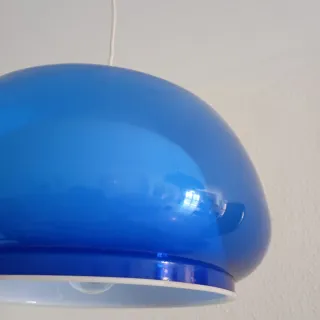 Lampada da soffitto originale, design originale degli anni '70, stile space age, composta da doppio schermo in plastica, interno bianco ed esterno in blu cobalto. In perfetto stato di conservazione e spettacolare quando accesa. Un pezzo poco comune perfetto per dare un tocco di colore a qualsiasi spazio. Diametro 40 cm, altezza 25 cm