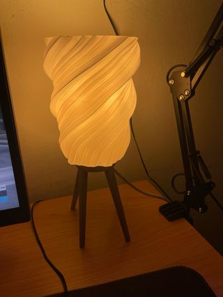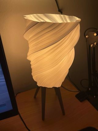 Lampada da tavolo dal design unico e moderno, con una forma a spirale che ricorda un elemento naturale. - Struttura in plastica con finitura bianca. - Base in legno scuro a tre gambe. - Illuminazione calda e diffusa.