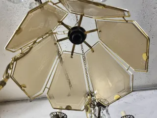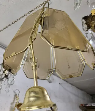 Pannelli in vetro satinato color ambra che presentano un'incisione serigrafata a forma di albero. Stile anni '80, la forma è poligonale, simile a un fiore. Montatura in ottone e metallo dorato. Impianto elettrico da verificare in base alle norme vigenti