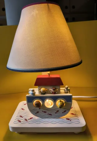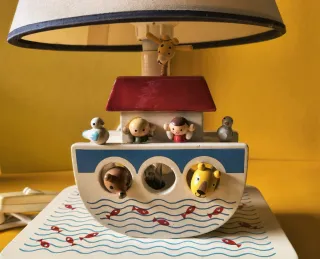 Lampada da tavolo vintage a forma di barca, un pezzo unico per la cameretta. Sevi. 20x13 h. 34 - Base decorata con onde e pesci rossi. - Elementi in legno dipinto a mano con animali e casetta. - Paralume in tessuto color crema.