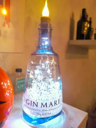 Lampada decorativa creata da una bottiglia di Gin Mare. Perfetta per aggiungere un tocco unico al tuo spazio. - Design originale con luci interne.