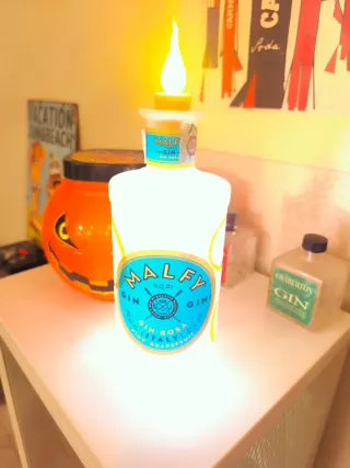 Lampada decorativa a forma di bottiglia di Gin Malfy. - Design unico con luci LED integrate. - Etichetta Malfy Gin Rosa. - Perfetta per creare atmosfera.