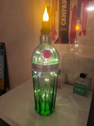 Lampada decorativa creata da una bottiglia di Gin Tanqueray. - Bottiglia in vetro verde. - Luci a LED integrate. - Tappo decorativo a forma di fiamma.