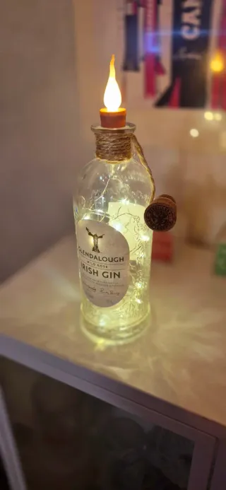 Lampada decorativa creata da una bottiglia di Glendalough Irish Gin. - Decorata con lucine LED. - Tappo in sughero decorativo. - Fiamma LED effetto candela.