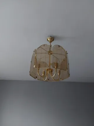 Lampada da soffitto (lampadario) vintage bianca e oro. Tipologia a fazzoletto, degli anni '60. In vetro, colorazione bianca ed oro e supporto in ottone. Meccanismo a sospensione con corda. Ottime condizioni, perfettamente funzionante. Anni 60 Lampadina non inclusa. Diametro: 37cm luce, lampada, lampadario, vintage, retro, arredamento