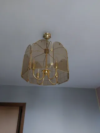 Elegante lampadario vintage con finiture dorate e dettagli in vetro. 4 punti luce. - Design a sospensione - Struttura in metallo - Elementi decorativi in vetro colorato