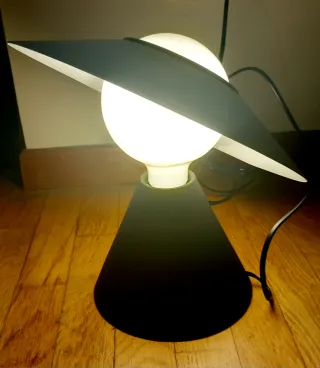 Lampada da tavolo in stile architettonico prodotta negli anni '80. Caratteristiche principali Design: Presenta uno stile italiano moderno e architettonico, caratterizzato da una struttura in metallo nero e un paralume semicircolare Dimensioni: Le dimensioni tipiche sono circa 39 cm di altezza, 34 cm di larghezza e 12 cm di profondità. Dettagli: Utilizza una singola lampadina con attacco E14 (non inclusa nelle descrizioni). Una delle lampade é difettosa per questo viene regalata insieme all’acquisto della prima