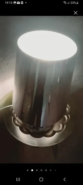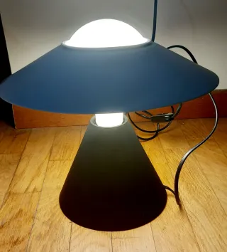 lampada da tavolo mostrata nell'immagine è il modello Fante di Stilnovo. È stata progettata nel 1978 dai designer Jonathan De Pas, Donato D'Urbino Design iconico: La lampada presenta un riflettore orientabile simile a un cappello a tesa larga posizionato sulla sfera luminosa, che ricorda un'elegante figura femminile. Funzionalità versatile: Il disco in alluminio verniciato bianco è inclinabile, consentendo di orientare la luce sia direttamente sulla superficie d'appoggio che indirettamente verso l'alto, creando diversi effetti luminosi. base conica è realizzata in silicone, cappello in alluminio. Completa di scatola e lampadina