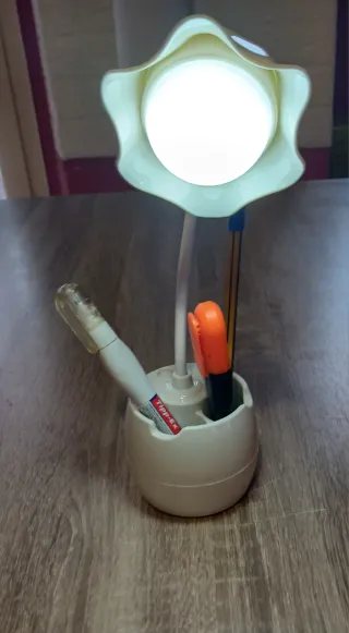 Lampada da tavolo con porta penne integrato, ideale per scrivania o comodino. Design moderno e funzionale. - Lampada con accensione touch. - Portapenne per organizzare la cancelleria. - Stickers in aggiunta per personalizzarla a proprio gusto. - Regolabile. - Cavo USB incluso. - 35 cm.