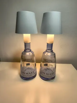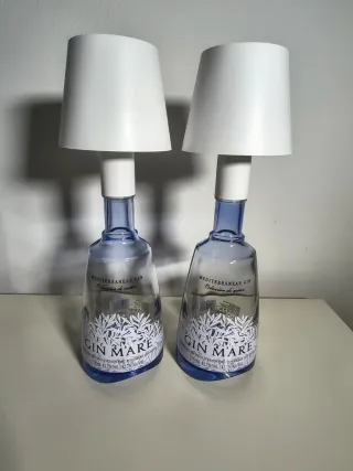 Set di due lampade realizzate con bottiglie di Gin Mare. Un'aggiunta unica per ogni ambiente. - Lampade con paralume bianco. - Base in vetro blu. - Alimentazione USB. - Le lampade sono nuove nelle proprie scatole ed inclusi cavi usb per ricaricarle. - Le lampade hanno 3 tonalitá di luce bianca : fredda, calda e rilassante.
