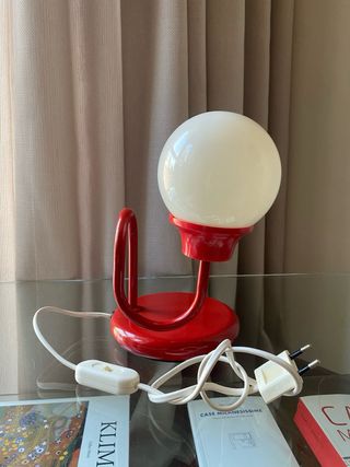 Piccola lampada da tavolo vintage con base e struttura in metallo rosso e paralume sferico in plastica bianca opaca. Dispone di una lampadina E14. Dimensioni: Larghezza tot. 15cm, h 20cm Ottime condizioni generali, perfettamente funzionante