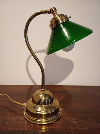 Lampada da tavolo in bronzo con cono in vetro opalino verde, in ottimo stato, revisionata e perfettamente funzionante, altezza cm. 33, diametro base cm. 13, diametro massimo cono cm. 15, monta una lampadina E14 non compresa, vista e piaciuta come da foto, consegna a mano zona Parma, su richiesta si effettuano spedizioni, per visionare altre lampade di modernariato, antiche o vintage cliccare sul mio profilo.