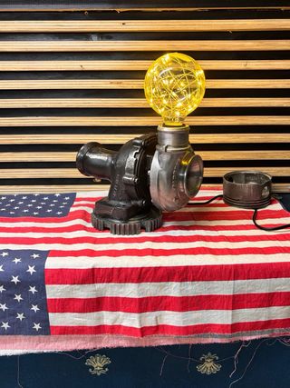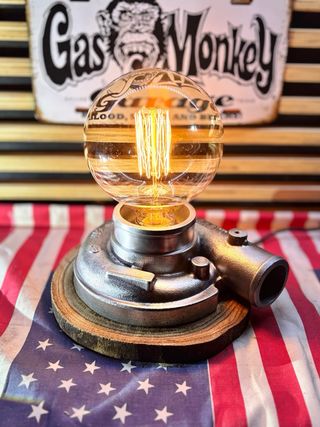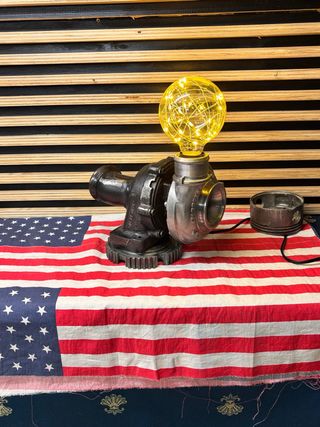 Bellissima lampada da tavolo realizzata con un vero turbocompressore! Un pezzo unico per amanti del genere. - Struttura in metallo e legno. - Design originale e accattivante. - Perfetta per arredare con stile.