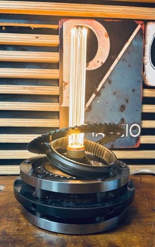Lampada dal design unico, ispirata al mondo dei motori e del garage. Perfetta per un'atmosfera industriale. - Base in metallo con ingranaggi. - Elemento centrale a forma di turbocompressore. - Lampadina a filamento con luci LED integrate.