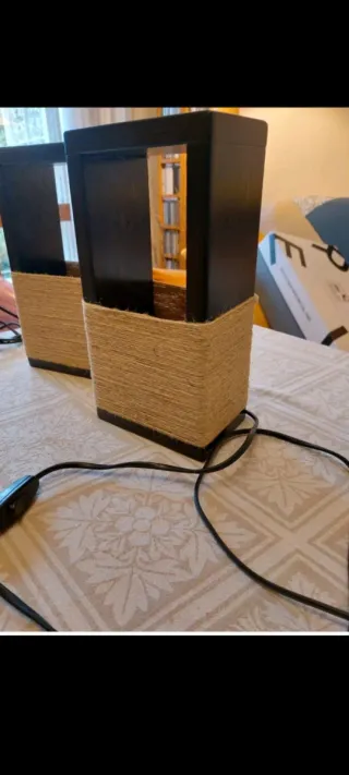Set di due lampade dal design unico, realizzate a mano misura cm 14x9,5xh 27,5 - Struttura in legno con finitura nera. - Rivestimento in corda di juta color beige. - Stile rustico e moderno.