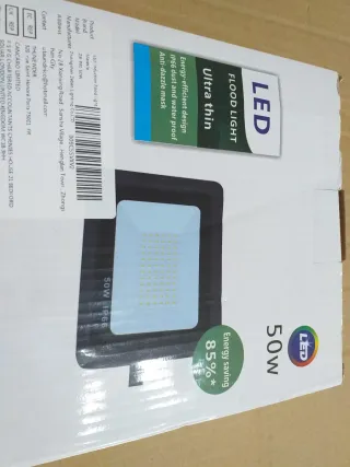 Faretto LED da 50W, ideale per illuminazione esterna grazie alla sua resistenza. - Design ultra sottile. - Efficienza energetica 85%. - Protezione da polvere e acqua IP66. - Maschera anti-abbagliamento.