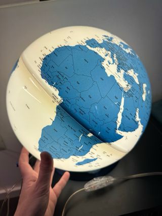 Lampada mappamondo dal design moderno, perfetta per arredare con stile. - Mappamondo Azure di Worldglobes. - Diametro 30 cm. - Base di supporto inclusa. Lampada mappamondo Atmosphere di design . 30cm. Bianco, azzurro, azzurro metallizzato. Composta da due sfere, una base d’appoggio rotonda e un perno verticale su cui ruotava il mappamondo, che purtroppo si è rotto. La lampada può essere usato solo appoggiata alla base , per il resto è in perfette condizioni e crea una bellissima illuminazione diffusa. Con scatola originale. #lampadasfera #lampadamappamondo #mappamondo #mappamondolampada #globo #globe #lamp #mappamondodesign #des