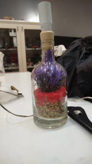 Lampada decorativa in vetro con un design unico. - Elementi decorativi interni: piante viola, sabbia rossa e sassolini oro - Tappo in plastica.