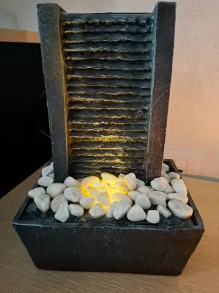 Fontana da tavolo zen in resina effetto pietra scura (slate/ardesia), con cascata rilassante, luci LED calde integrate e ciottoli bianchi naturali inclusi. Crea un'atmosfera feng shui perfetta per ufficio, soggiorno o camera – suono dell'acqua super calmante per meditazione e relax! Funziona benissimo (cavo incluso), in ottime condizioni, sembra nuova. Ideale per chi ama il benessere zen a casa 🔥 #FontanaZen #CascataDaTavolo #RelaxZen #FengShui #FontanaInterna #LEDlights #PietreNaturali #DecorazioneCasa #ZenRelax #VintedItalia #SecondHand #ArredoZen #Meditazione #HomeDecor #UfficioZen